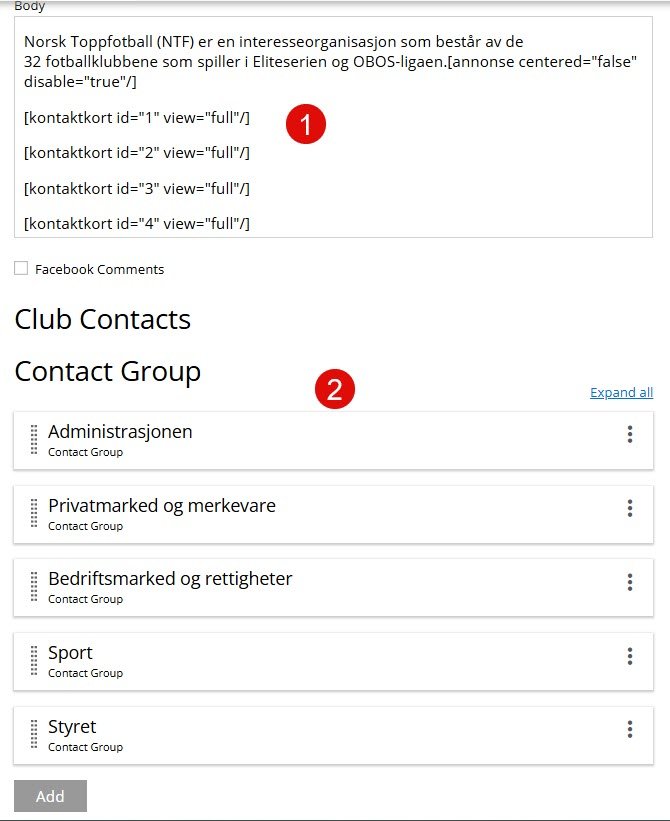 Slik ser det ut det som styrer kontakt oss siden på toppfotball.no inne i Content studio: